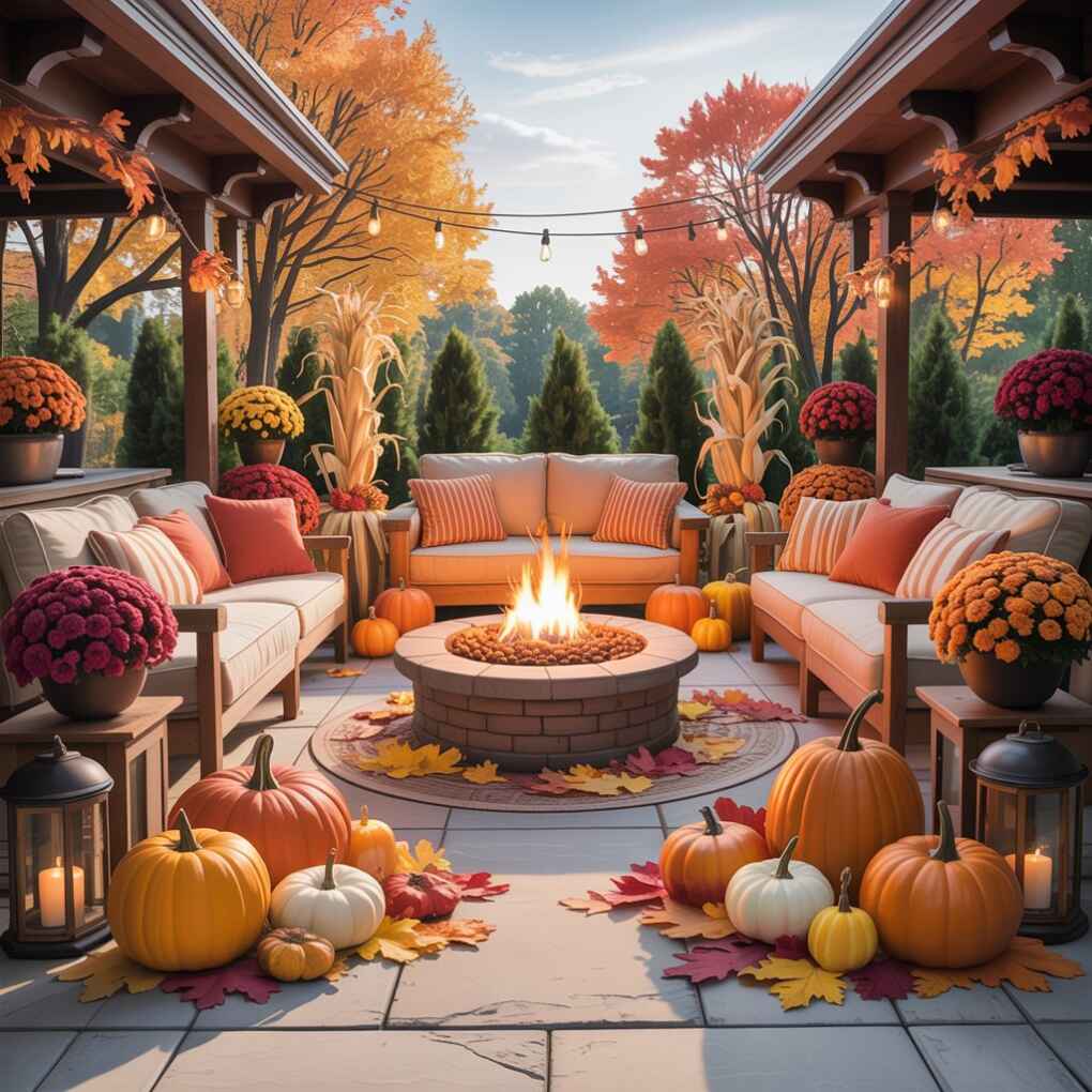 Create a dedicated fall gathering spot around your fire pit with comfortable seating and seasonal accents. Add weather-resistant cushions in autumn colors and arrange pumpkins around the perimeter for seasonal context. This space becomes the heart of outdoor entertaining during cooler weather.
