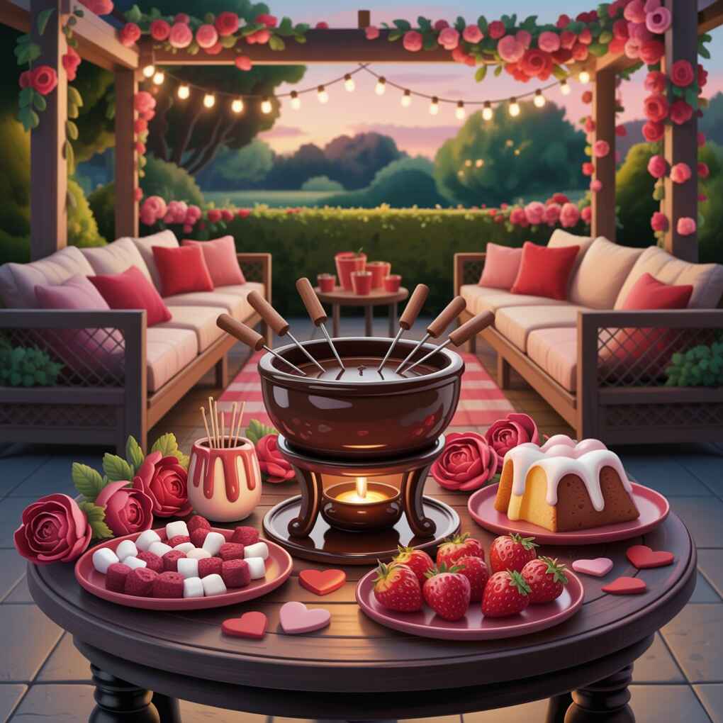 Create interactive romance with a dedicated chocolate fondue station featuring skewers of fruit, marshmallows, and pound cake. Present it on a decorative tray with elegant dipping tools and a small vase of fresh flowers for visual balance. The communal aspect transforms dessert into shared experience while the melting chocolate provides captivating visual and aromatic elements.